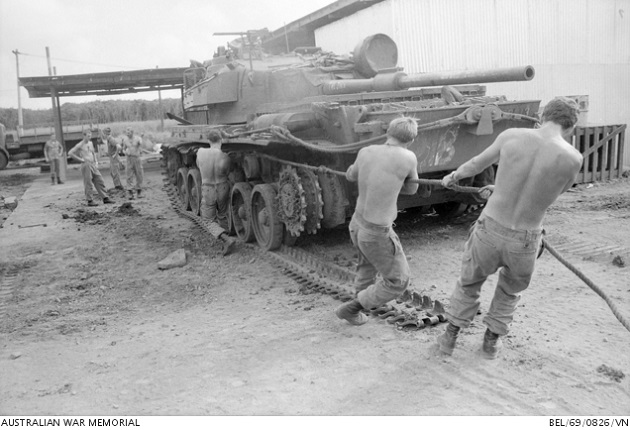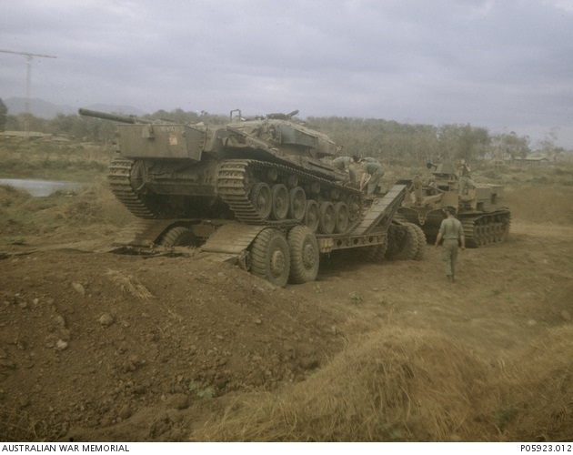In December 1968, Centurion tank, ARN 169017, was badly damaged by a mine. A Centurion ARV is winching the damaged Centurion onto an M151A2 trailer which is towed by a M123C Prime mover.