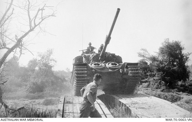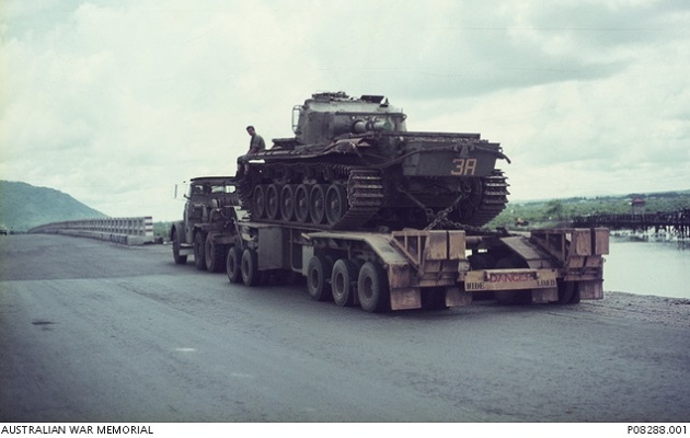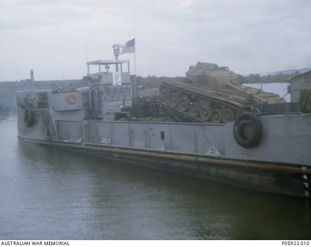 Getting the Centurions off the Jeparit and move them to the Australian main base was a problem. The Americans helped by bringing down a 70 ton ‘Big John’ floating crane from Saigon which lifted the Centurions onto a US Landing Craft Utility (LCU). The LCU then made a short trip, carrying three Centurions at a time, around the peninsula and up the Sông Dinh (river) to a landing west of Bà Rịa. From Bà Rịa, the Centurions were driven up Route 2 to Nui Dat.