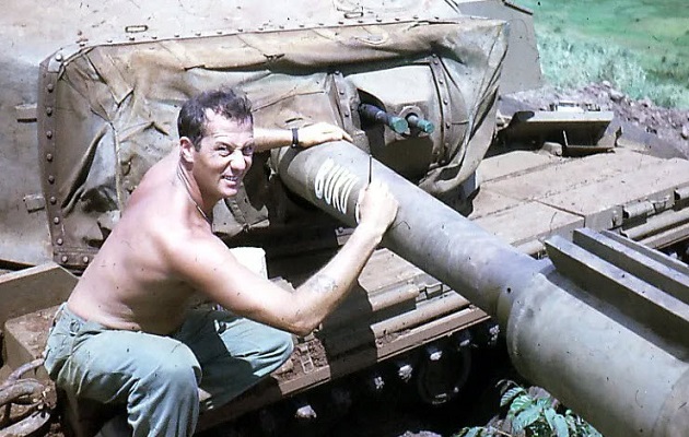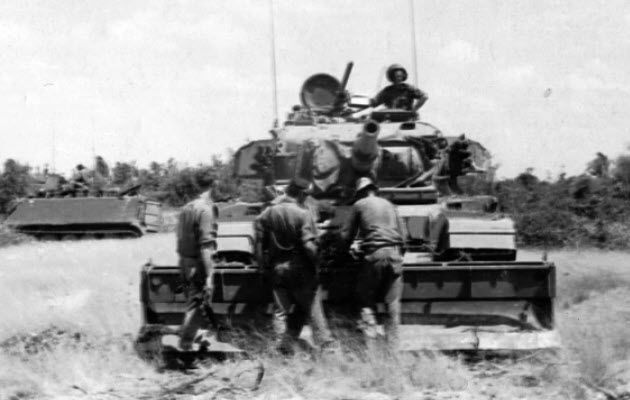 During a break, the tank crews enjoy a refreshing drink while standing on their tanks. Note the large Vietnamese sign in the foreground.
