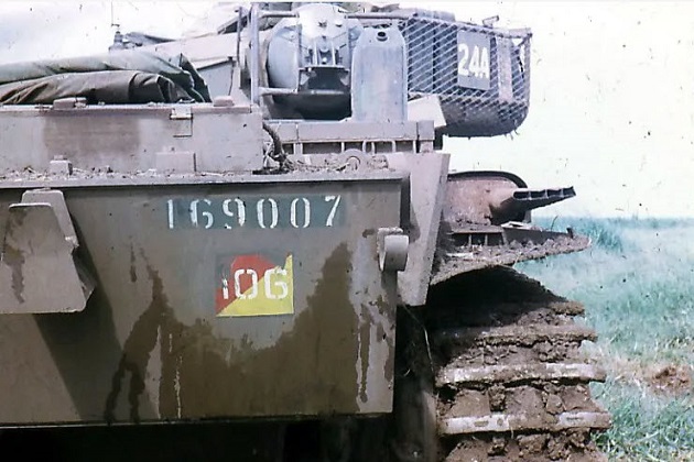 On June 25, Centurion, ARN 169056, with call sign 5B was hit by a RPG. It struck the main gun barrel on the lower right side, penetrating at an angle. The driver’s headphones are hanging on the vision block of the open hatch. Most of the canvas mantlet cover was burnt off showing the casting markings.
