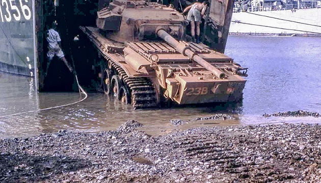 A Centurion of C Squadron being driven off a LCU onto a rocky beach on the outskirts of Bà Rịa in March 1968.