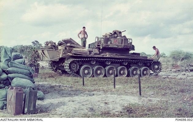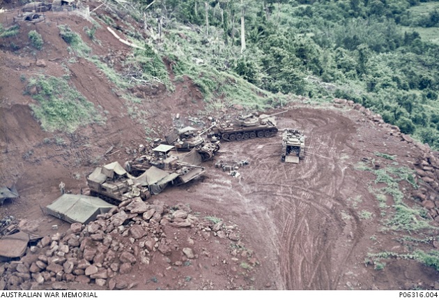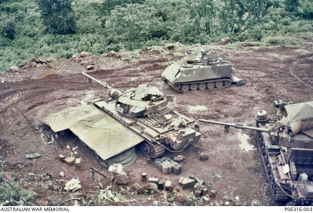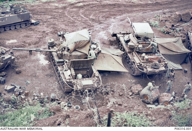 This view is looking down from the top of Courtenay Hill at three Centurion tanks, one of which, Five Alpha (5A) on the right, has a dozer blade mounted. There is also a Centurion ARV (extreme right) and an M113A1 Fitters Carrier at the top left. Some of the crewmen are gathered around or sitting on MOGAS rubber fuel bladders (bottom right).