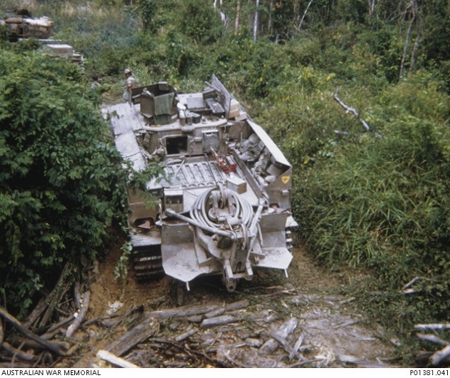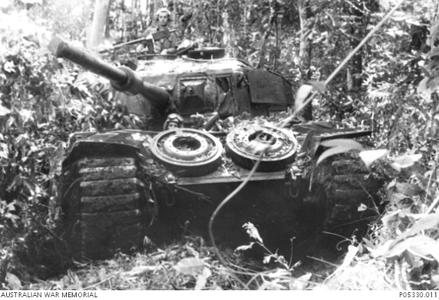 A Centurion of C Squadron slipped off the road and got stuck in a ditch. Troopers had filled the ditch in front of the tank with cut wood to throw under the track for traction. Note the left track had tore up the road surface. The troopers are taking a smoko (smoke) break.