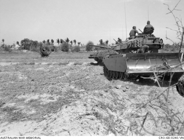 Two Centurions are being used to support the infantry during Operation Pinnaroo. The tanks are fitted with special bulldozer blades and are clearing suspected mined and booby-trapped areas in the Long Hai Hills.