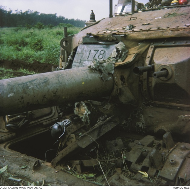 Unfortunately, the enemy position was not where it had been reported and the assault continued for over an hour. All surprise was now lost and the enemy had time to consolidate their defences. At this point, one of the tank drivers was injured by branch which fell from a large tree. He was quickly replaced, but soon after the forward left Centurion was hit by an RPG. It struck the top of the turret just in front of the cupola, and, with the turret hatches open, both the commander and operator were wounded. Once the casualties were evacuated, the attack continued … another tank was hit, wounding the ‘new’ driver. The frontage was saturated with fire, with the surrounding vegetation above knee height being totally shredded. Despite this, a third tank was hit by an RPG. Although the RPGs had damaged the barrels of both tanks, they continued firing. Finally, the position was dominated and the enemy withdrew (towards the attackers to avoid artillery cut-off fire). It was 7pm by the time the tanks rebombed with ammo. They had fired sixty canister, four HE, two APCBC, 11,000 .30cal and 800 rounds of .50cal..”