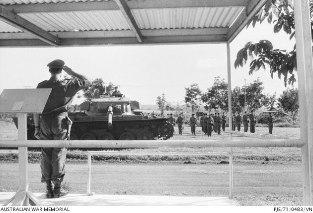 At Nui Dat, Colonel D. D. Weir, Deputy Commander of the 1 ATF, takes the salute from the men of C Squadron, as the unit’s last Centurion to be withdrawn from Vietnam drives ceremoniously from the parade ground.