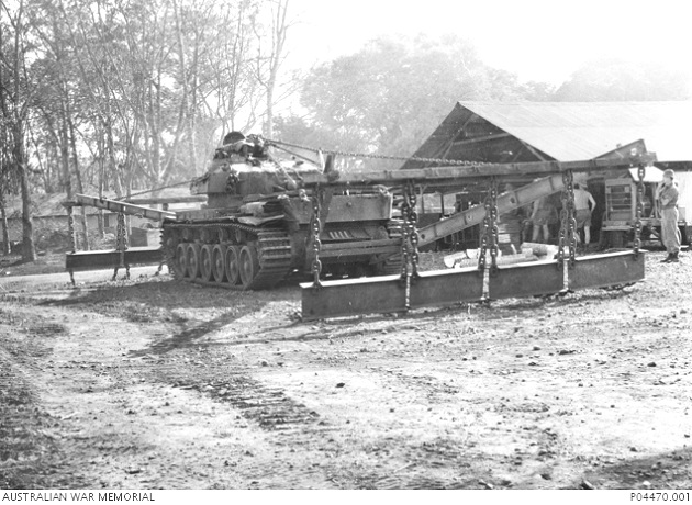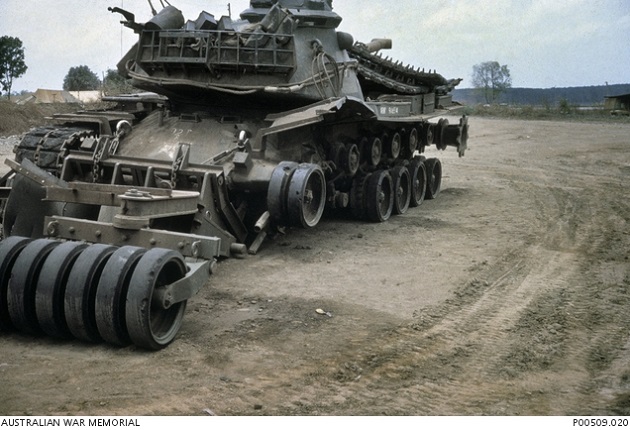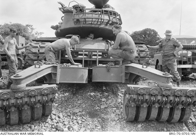 In September 1970, troopers of 1st Field Squadron, RAE, make final adjustments to a mine roller. The tank, a US M48A3 Patton tank, and the mine rollers were on extended loan from the US Army. After the device was fully tested at Nui Dat, it was put into operations in the Phuoc Tuy Province to clear roads and tracks were possibly mined by the enemy.