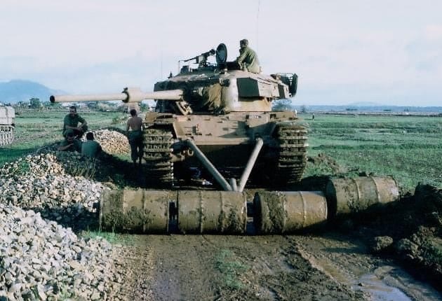 On 29 August 1970, a Bell OH-13 Sioux (“Possum”) helicopter of the 161 (Independent) Reconnaissance Flight is about to land on a Centurion Bridge Layer during Operation Massey Harris.