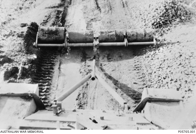 The 1st Field Squadron, Royal Australian Engineers (RAE), fitted this field built mine clearing sled to the front and back of a Centurion gun tank in early 1968.