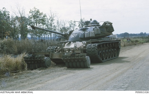 The M48A3 tank with mine clearing roller parked on the roadside somewhere in the Phuoc Tuy Province. The tank was usually crewed with three Australian sappers from 1 Field Squadron. Note the call sign 92.T (Nine Two Tango) painted on the side of the turret and the white star covered with dust on the front hull.