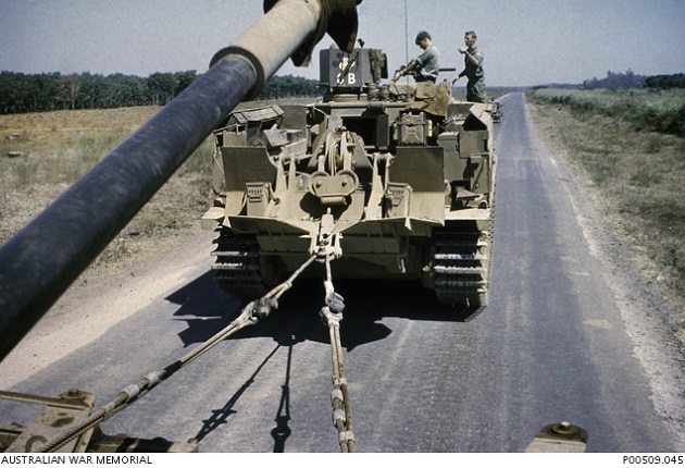 A pair of Centurion tanks are guarding the approach road to Courtenay Hill. Note the ration boxes piled on top of the external fuel tank on the rear hull of the tank.