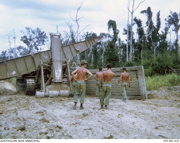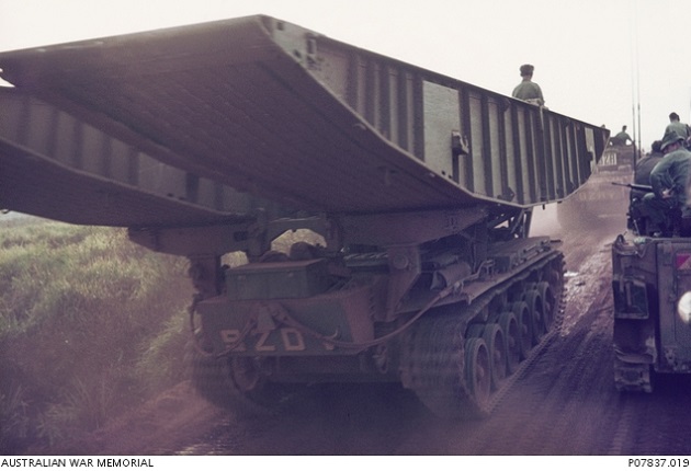 A Centurion bridge layer with call sign 92D is laying a bridge span over a watercourse in Phuoc Tuy Province, 1968.