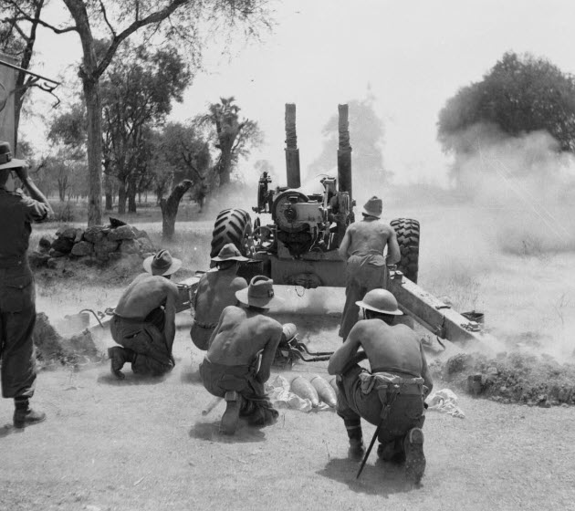 A British 5.5-inch (139.7 mm) medium gun of the 498th Battery, 134th Medium Regiment, firing over open sights at point blank range against the north wall of Fort Dufferin on March 10th.