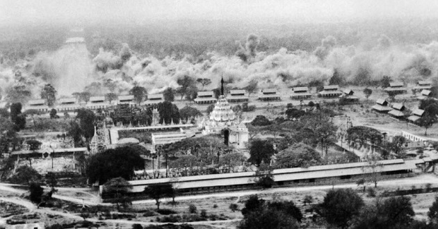 Mandalay, the second largest city in Burma (today Myanmar) is located on the east bank of the Irrawaddy River. In May 1942, Japanese forces seized Mandalay against little or no resistance. In March 1945, the Allies retaking Mandalay was the largest battle fought during the 1942–1945 Burma campaign in WWII involving tanks, artillery and aircraft.
