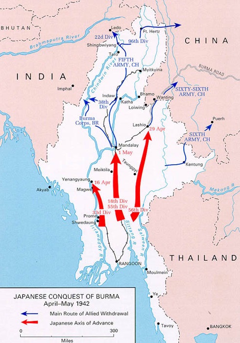 On 26 May 1942, the British forces successfully retreated across the Indian border. Along the way, they destroyed precious oil fields so that they could not be used by the Japanese. As the British crossed into India, Japanese forces captured the entire country of Burma, including the vital airfields in Myitkyina near the Chinese border.
