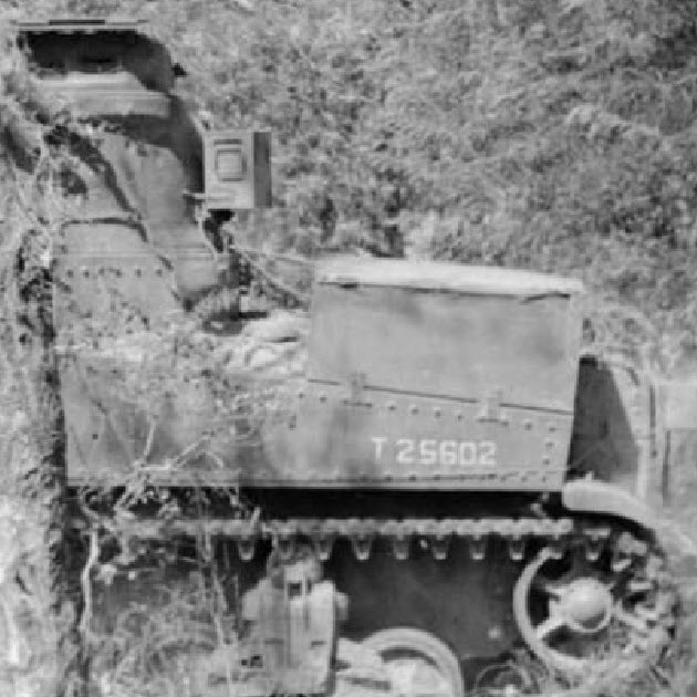 This is a T-16 Universal Carrier parked on a stand to the left of a gun pit. From 25 March 1943 until 1945, the Ford Motor Company (FMC) Sommerville plant near Boston, Massachusetts, produced a total of 13,893 T-16s. Sunlight appears to be hitting the side armor of the carrier and trees are casting shadows on it.