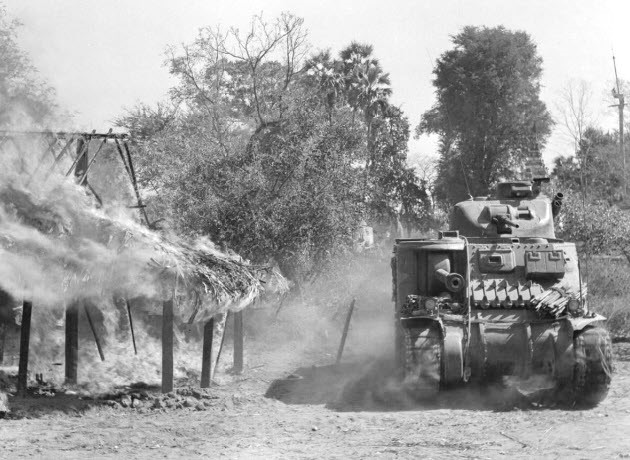 A Lee tank supporting infantry during the advance south from Mandalay on March 20th. The tank is about to demolish the abandoned hut.