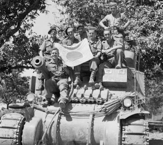 The whole crew (7) of Lee tank “T25602” pose with a captured Japanese flag south of Mandalay on March 20th.
