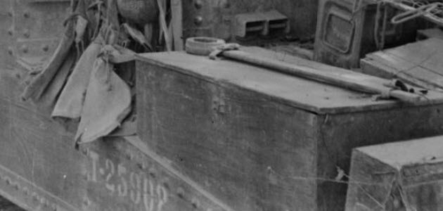 This is my close up of the rear of Lee tank “T25602”. This shows the side details of the ammo can on the turret rear. There is also a telephone box mounted on the rear hull plate which allows the infantry to communicate with the tank crew. The rear engine deck appears to be covered with barb wire where the intention was to make it more difficult for Japanese infantry to climb on board.