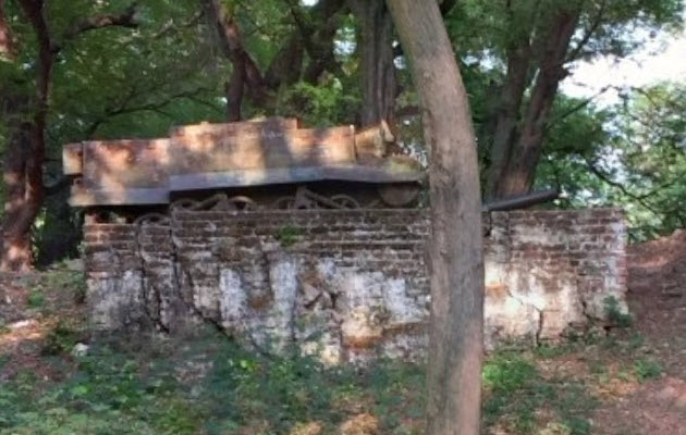 This is the rear of the carrier pictured above. The T-16 had a controlled differential steering system, a Ford Mercury engine, a different bogie system (4 road wheels where the British carriers had 3), a longer, redesigned and simplified welded hull structure, and refinement of the tracks and suspension. They were supplied thru Lend Lease to the British and other commonwealth countries. To the right of it is the gun pit with an old cannon.