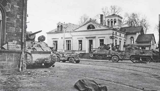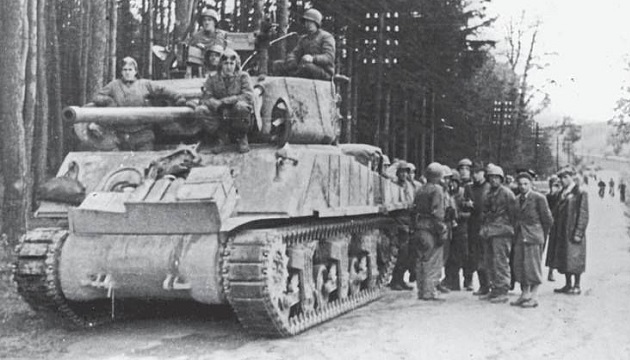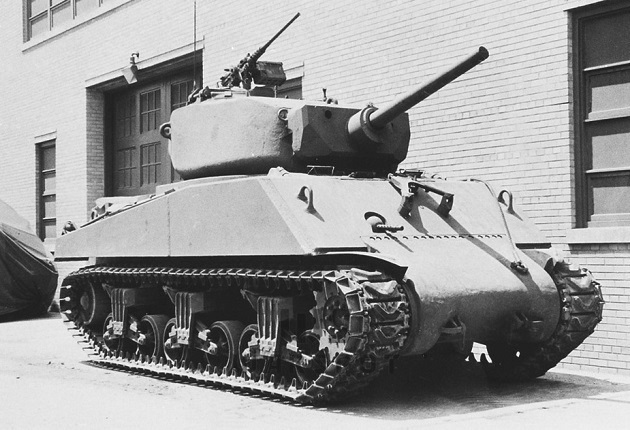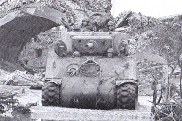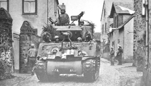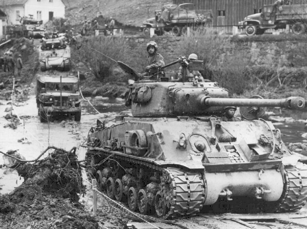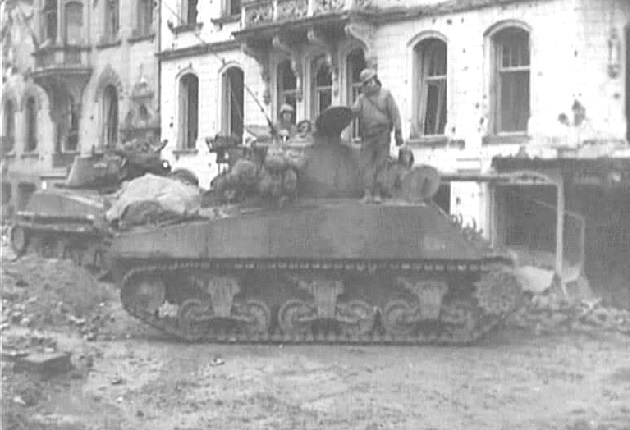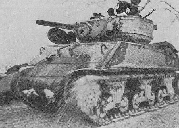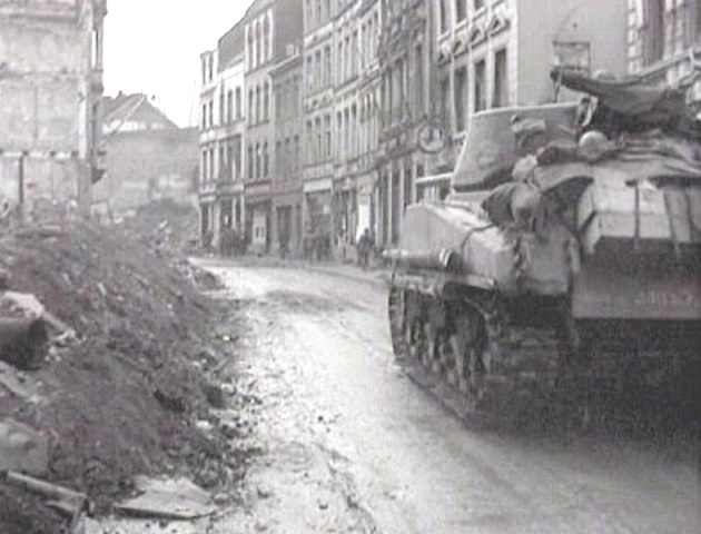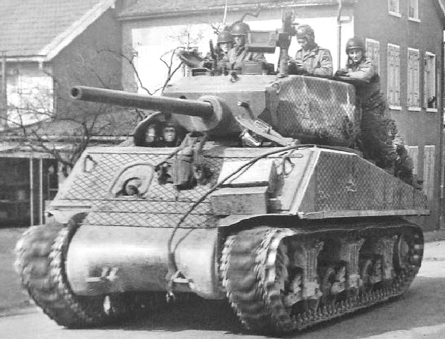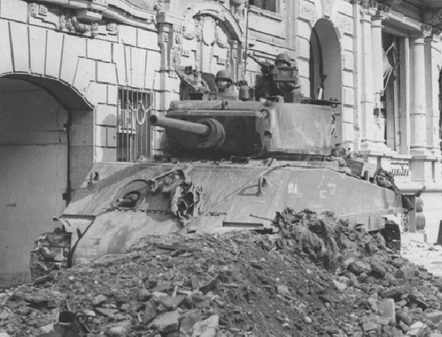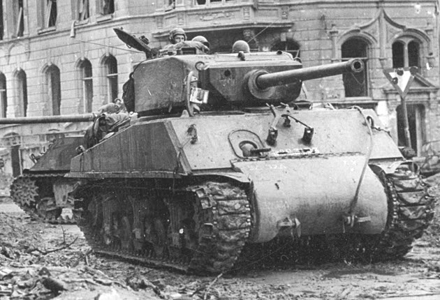 A M4A3E2 of the US 4th Armored Division driving through Koblenz on 9 March 1945. The 76mm gun is secured in the gun travel lock on the front hull. Note the white flags on the buildings on the right.