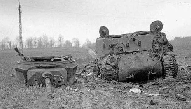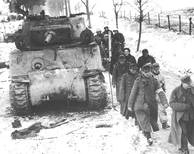 Germans POWs marching past past a knocked out M4A3E2 north of Foy, Belgium on January 25th . Note behind the M4A3E2 is another snow covered Sherman on the side of the road.