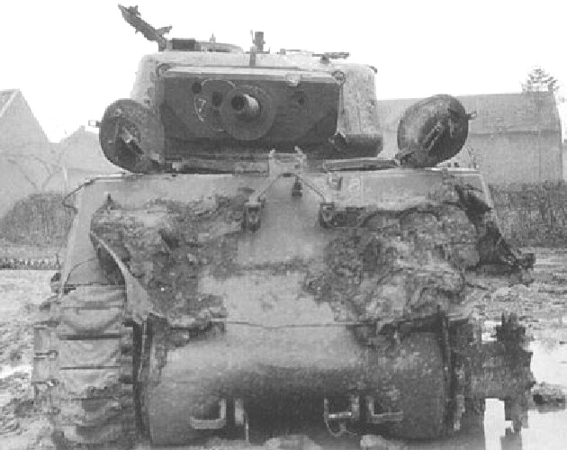 This is the rear of a M4A3E2 moving down a street in Cologne on March 6th. Note the two logs on the hull side. On the rear of the turret, the .50 Cal machine gun is covered with canvas.