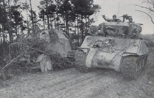 Shermans of the US 3rd Armored Division in the Ardennes, December 1944. A M4A1(76)W Sherman is on the left and a M4A3E2 is on the right. There appears to be a letter “U” on the M4A1(76)W Sherman’s gun mantlet. Its meaning is unknown.