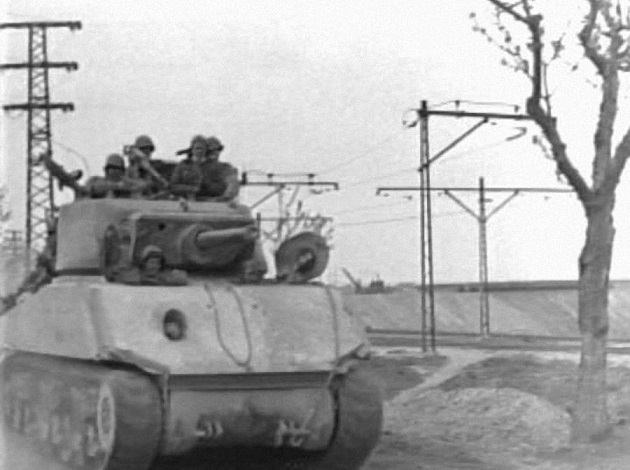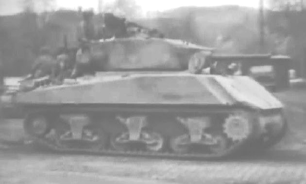 A M4A3E2 with concrete applique on the glacis. The date and location are unknown. This is a frame from a US Army Signal Corp film.