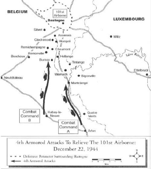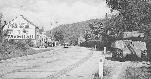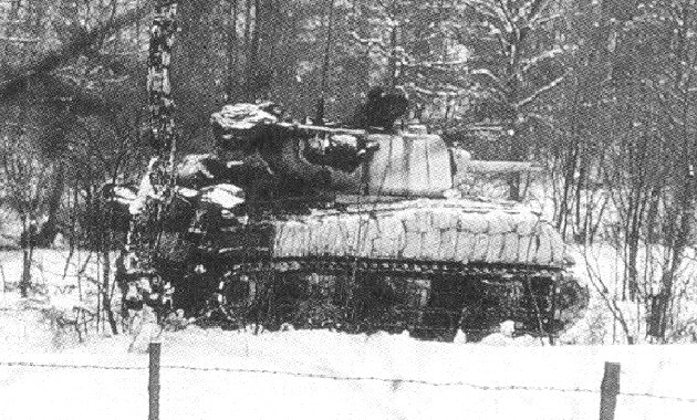 During the German Ardennes offensive (Battle of the Bulge), the important crossroads town of Bastogne, Belgium had been cut off and surrounded by German forces. The US 101st Airborne Division held out against enemy forces for 5 days and refused a surrender ultimatum from the German commander with the famous reply “Nuts!”. Patton’s 3rd Army was tasked with trying to break through the German lines from the south with the 37th Tank Battalion, 4th Armored Division as the main spearhead of this counterattack. Under temporary command of XO, Captain William A. Dwight (S-3), the column took a secondary road leading from Clochimont through Assenois to Bastogne.