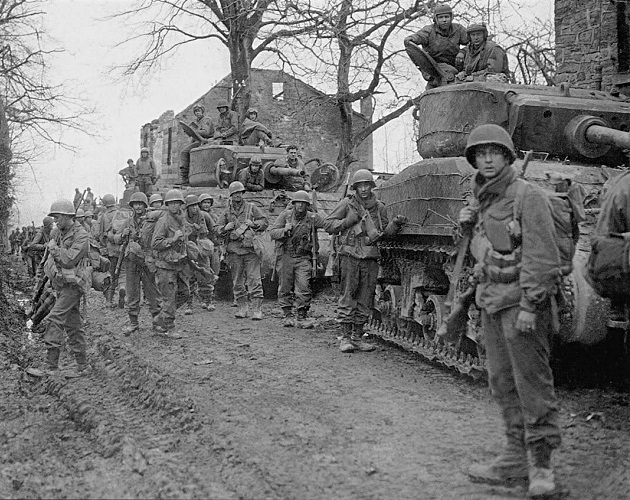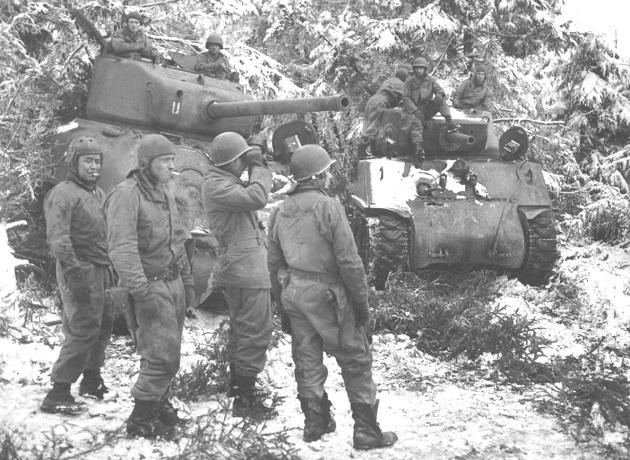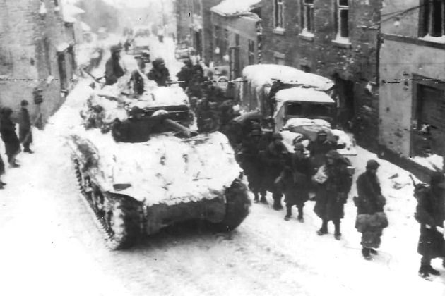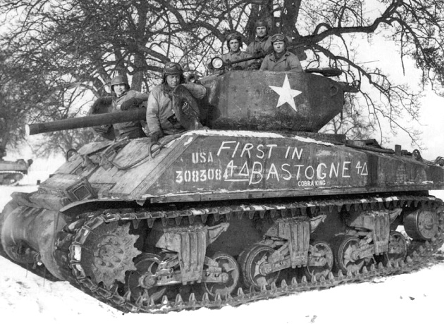 Cobra King was the lead vehicle with 8 tanks, half-tracks, and some other vehicles following. The column moved at full speed, firing straight ahead, with the other tanks firing left and right and they did not stop for anything. As soon as they cleared the first small town, artillery support was called (4 artillery battalions were available) to fire on Assenois which was ahead. The column entered Assenois while still under friendly fire. After clearing Assenois, they ran into more enemy resistance, and mopping up was required by the accompanying troops of C Company, 53d Armored Infantry Battalion. They then came across a large pillbox, which was destroyed immediately. There was a lot of confusion, since the Germans did not expected a break through along the secondary road, nevertheless enemy fire was considerable, and 4 Shermans were knocked out on the way. As King Cobra cleared the following woods, it came upon an open field with colored canopies (from previous supply drops) which indicated they were approaching friendly lines. The column subsequently slowed down, on the look out for friendlies, and spotted a number of foxholes with helmeted figures. Taking no chances, they called out to them, shouting for them to come out. They yelled that they were the 4th Armored Division. After several calls, an officer emerged with a smile, and said “I’m Lieutenant Webster, 326th Airborne Engineers, glad to see you guys!” At 1650 hours on December 26th, the 4th Armored Division, had broken through enemy lines and reached its objective – the siege of Bastogne was over although the fighting was not.