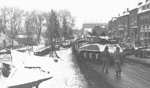 A snow covered M4A3E2 of the 3rd Armored Division supporting the US 83rd Infantry Division moves through Lierneux (north of Bastogne), Belgium.