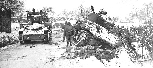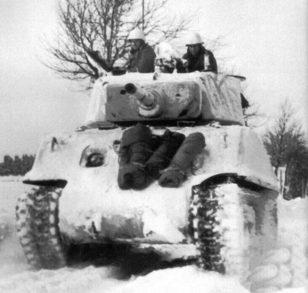 Hard going for US tanks at Amonines (southwest of Manhay), Belgium, on the northern flank of the Ardennes in January 1945. A M5A1 Stuart light tank (left) passes a M4A3E2 which slid off the icy road and got stuck in the ditch. The fresh dirt/mud on the snow in front of the tank indicate that the crew was trying to dig it out. Note that the M5A1 has a single track grouser mounted on each track which improved its traction on muddy or icy roads.