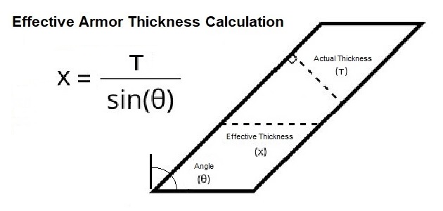 The relative armor thickness (X) can be calculated by dividing the actual armor thickness (T) by the sine of the angle (θ). The large hatch sloped glacis plate of the M4A3E2 is 47 degrees from the vertical. For this calculation, we need to subtract 47 from 90 degrees, 90 – 47 = 43 degrees. It is important to use degrees, not radians, when doing this calculation. The relative armor thickness (x) is 4 inches (101.6 mm) divided by Sin(43 Degrees) which equals 5.86 inches (148.84 mm) for the M4A3E2.
