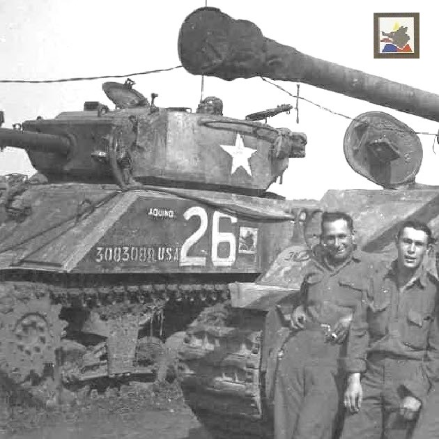 This M4A3E2, registration number 3083088, named “Aquino” belonged to A Company of the 15th Tank Battalion, US 6th Armored Division. To the right of the tank’s “speed” number 26 is the grey wolf head insignia (inset) of the 15th Tank Battalion. Aquino is a surname of Italian, Spanish, and Portuguese origin. It is a Christian name in honor of Thomas Aquinas (1225 to 7 March 1274), an Italian Dominican friar and a Doctor of the Church (Latin: doctor “teacher”).