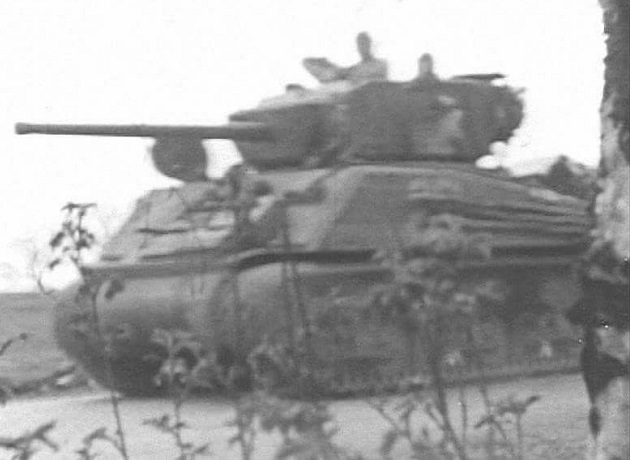 This is another photo of M4A3E2 “Aquino” taken from a film frame. The logs on the hull side are partially covering the large 26 speed number. This photo shows that M4A3E2 “Aquino” was also upgraded with the 76mm gun.