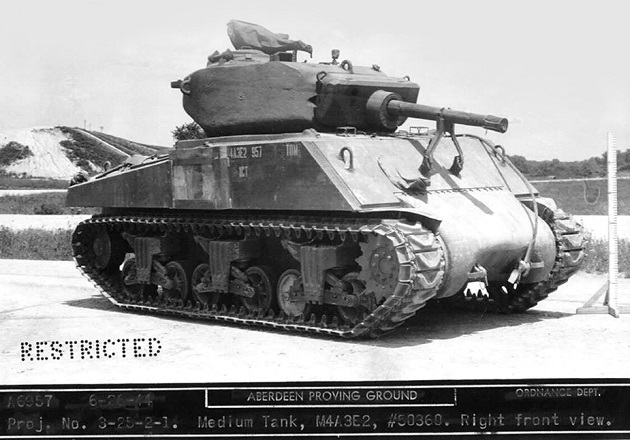 On June 8th, M4A3E2 Sherman, serial number 50326, USA 3082957, was shipped to the Chrysler Tank Arsenal Proving Ground in Detroit for endurance trials. After the endurance testing, tank 50326 was sent to the Aberdeen Proving Grounds (APG) in Maryland for ballistic testing. This photo shows “TOM,” Serial Number 50360, on the test course at APG on 26 June 1944.