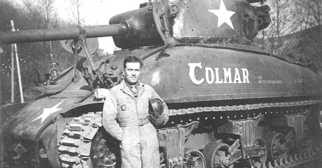 Lieutenant FALGAYRAC standing beside his M4A1(76) Sherman named “COLMAR”. The tanks of the 2nd squadron were named after towns in France. Note the T47E1 bar cleat tracks with extended end connectors “duck bills”.