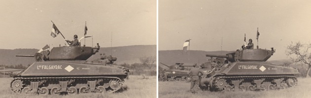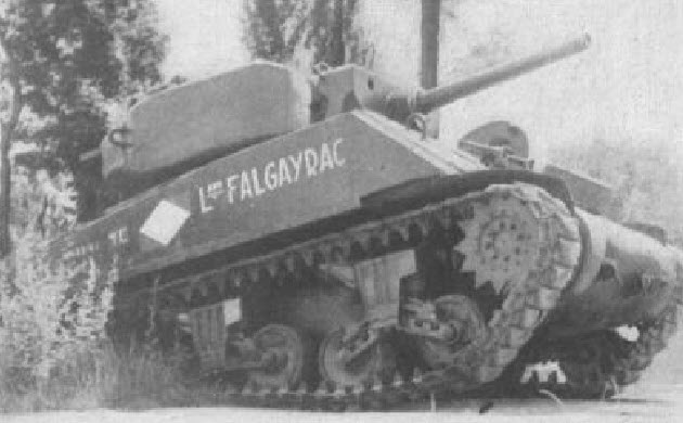 A few days later, the M4A3E2 was renamed “Lt FALGAYRAC” in his honor. Beside the name on the hull side is a 1804 Napoleonic French regimental flag which was typical for tank units of the French 1st Army.