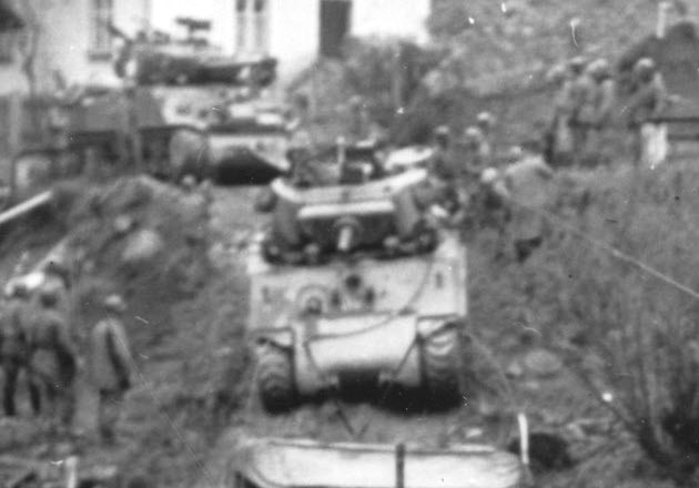 This is the same M4A3E2 in the above photo halted in Alzey. Moving up along side it is a M4A3E8 HVSS Sherman armed with a 76mm gun with a muzzle break but has thinner armor.