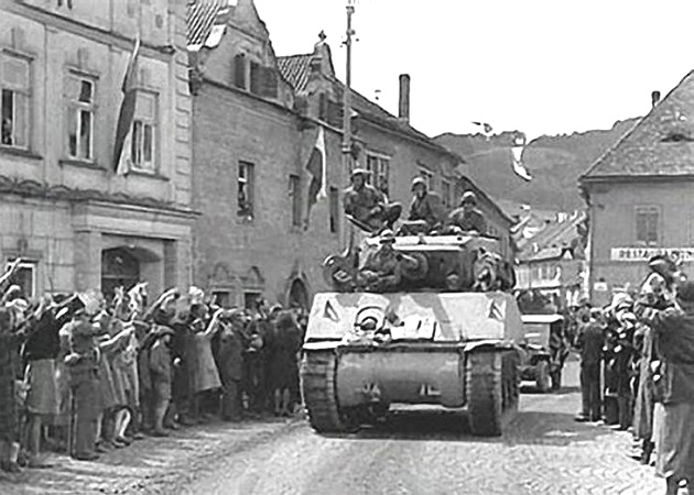 A M4A3E2 drives through the town of Sušice, in the Sudetenland in Western Czechoslovakia while its citizens are cheering on Czechoslovakia’s liberation day, 6 May 1945.