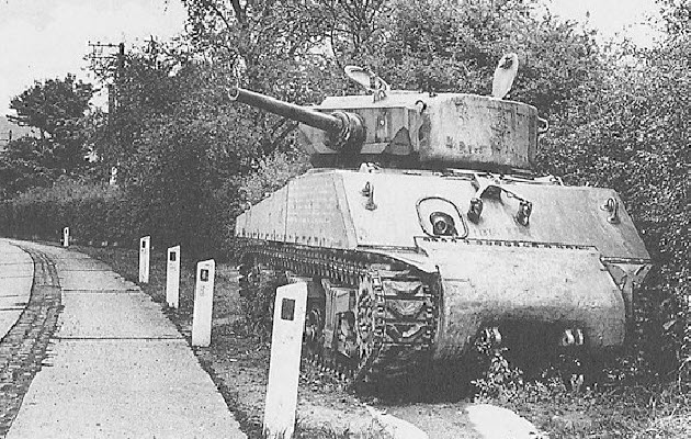 This another view of the street in the photo above. The M4A3E2 Sherman with logs on the hull side is in the background.