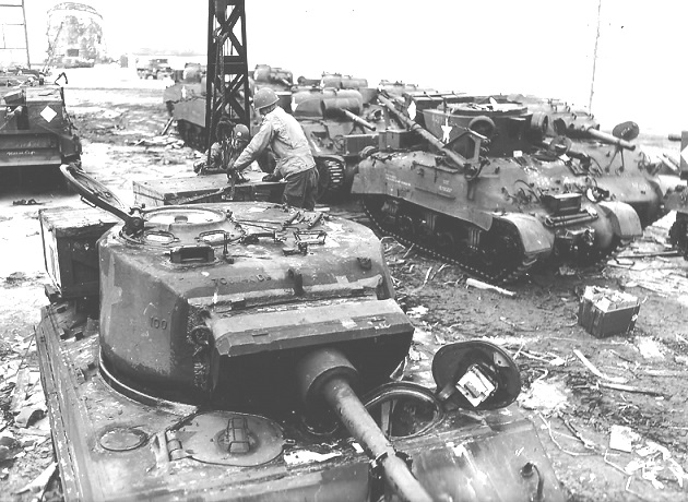 US tanks, immediately after being put ashore at Cherbourg are being readied by ordnance crews to be transported to the units. All external fixtures and loose equipment for the tanks were packed in crates and carried on the tank’s engine deck. In the background are M4 Shermans, a M4(105mm) Sherman and a M32B1 ARV.