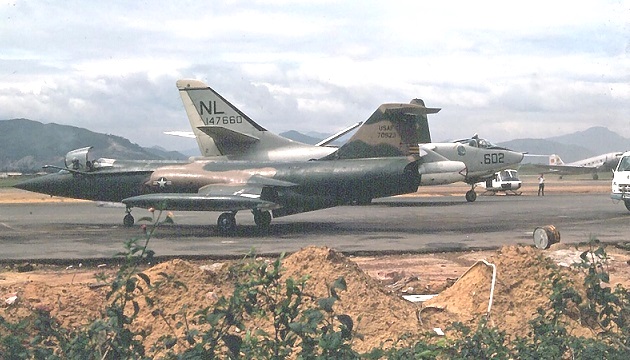F-104C 57-0923 at Da Nang Air Base in late November 1966 on it way back to the USA. Behind it is a Douglas A-3B Skywarrior Bomber/Tanker of CVW-15 VAH-8 off the USS Constellation (CVA-64).