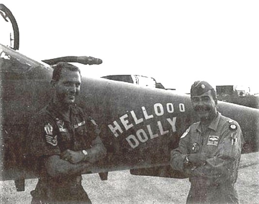 Crew Chief Sergeant Bennet and Preciado pose next to “Hellooo Dolly”, July 1967.