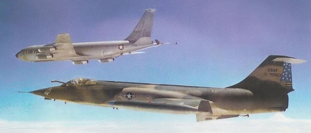 A Starfighter refueling in flight from a KC-135A tanker.