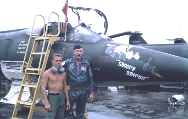F-104C-5-LO 56-0891 arrived at Udorn in January 1967. Later in 1967 this aircraft, piloted by Major Herb Drisko, received a nice nose art painting on both sides of its nose. On the starboard (right) side, the Peanuts cartoon character Snoopy was painted wearing a brown WWI leather helmet and a yellow scarf, riding and firing a 20mm Vulcan Gatling Gun. Beneath Snoopy and the gun was the name “SNOOPY SNIPER”. By that time, Herb Drisko was “F-troop” flight commander.
