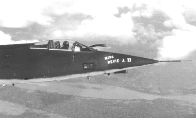 F-104C-5-LO 56-0892 arrived at Udorn in February 1967. It was flown by Major Floyd Totten who decided to put the name of his first girlfriend on the nose of his Starfighter and it was the sixth aircraft which Floyd had named “Miss Bevie J”.