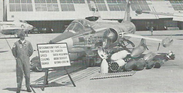 On 4 May 1962, this 479th TFW F-104C-5-LO is on display with ordnance at Eglin Air Force base in Florida for US President Kennedy’s inspection. The range and Ceiling numbers on the poster reflect optimum figures, would not be achieved in combat.