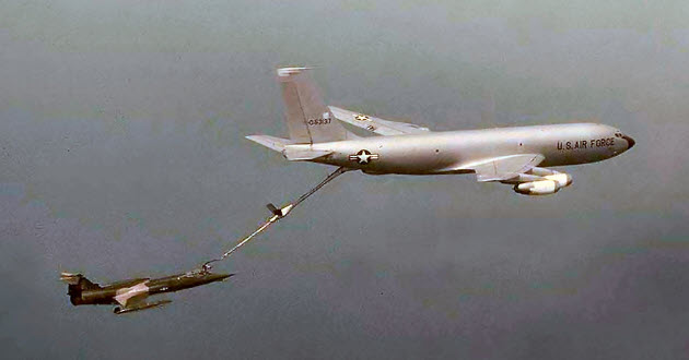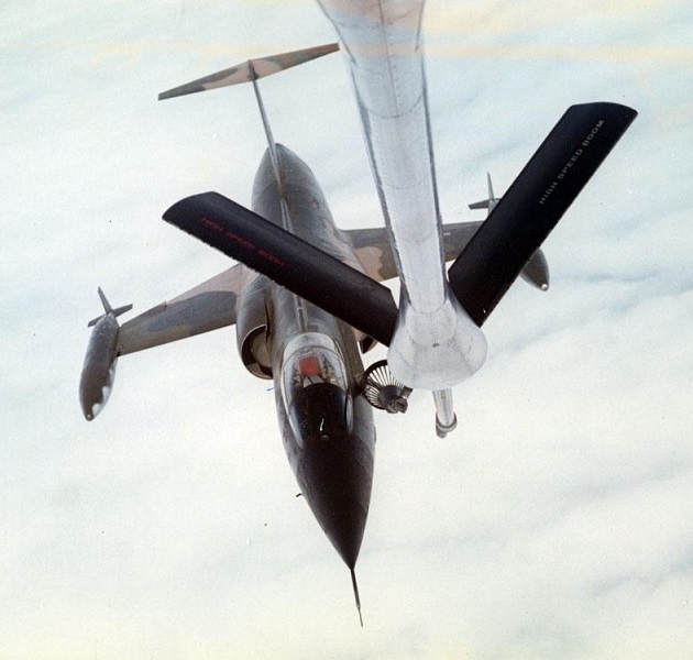 This is the KC-135A boom operator’s view of a F-104C refueling in flight. The fuel tanks under the wings were jettison-able in flight.